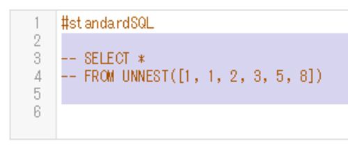 範囲を選択してCtrl + /を押せばよいみたいです(Macの場合は⌘ Cmd + /) BigQueryのキーボードショートカット 以下の範囲選択した状態でCtrl + /を押すと 文字が書かれている部分だけコメントアウトされます 逆にこの形式(先頭に-- )でコメントアウトされてい…