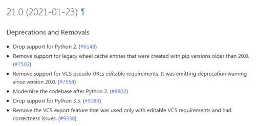 1月23日頃に出た pip 21.0 でついにPython 2系のサポートが切られてインストールできなくなりました https://pip.pypa.io/en/stable/news/ pip 21.0 Deprecations and Removalsstackoverflow.comhttps://bootstrap.pypa.io/2.7/get-pip.py などに古いバージ…