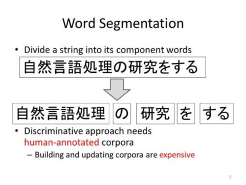 "Discriminative Learning with Natural Annotations: Word Segmentation as a Case Study" (pdf) 研究室で論文紹介したので以下に資料を貼っておきます。 図表は論文中から引用しています何故か研究室での論文紹介は、資料が英語で口頭説明が日本語なので、…